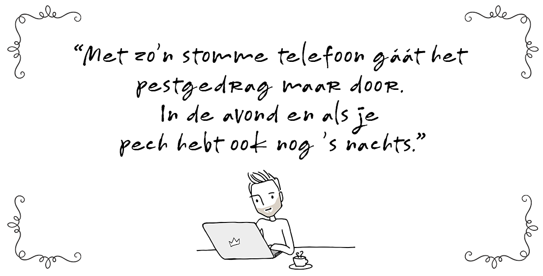 Vlak voor de kerstvakantie kregen we een berichtje van de basisschool waar zoonlief inmiddels in groep zes rondhuppelt. Om ons te informeren dat er een appgroepje van groep 6-7-8 actief was en dat leerlingen met elkaar buiten schooltijd via die weg contact hadden met elkaar via WhatsApp. En wat bleek? Het gaat er daar niet ‘altijd even gezellig aan toe’ was de conclusie. Een gevoel dat in de klas ook leeft, maar ja, dan stopt het tenminste als je naar huis gaat. Met zo’n stomme telefoon gáát het pestgedrag maar door. In de avond en als je pech hebt (en geen grenzen opgelegd krijgt thuis) ook nog ’s nachts. En dan heb ik ’t in dit geval over kinderen van negen, tien en elf jaar. Onze zoon krijgt pas toegang tot een smartphone als ie naar de middelbare school gaat, maar inmiddels weet ik dat we daarmee niet alleen rijkelijk laat zijn, maar echt een uitzondering op wat er om ons heen allemaal gaande is.